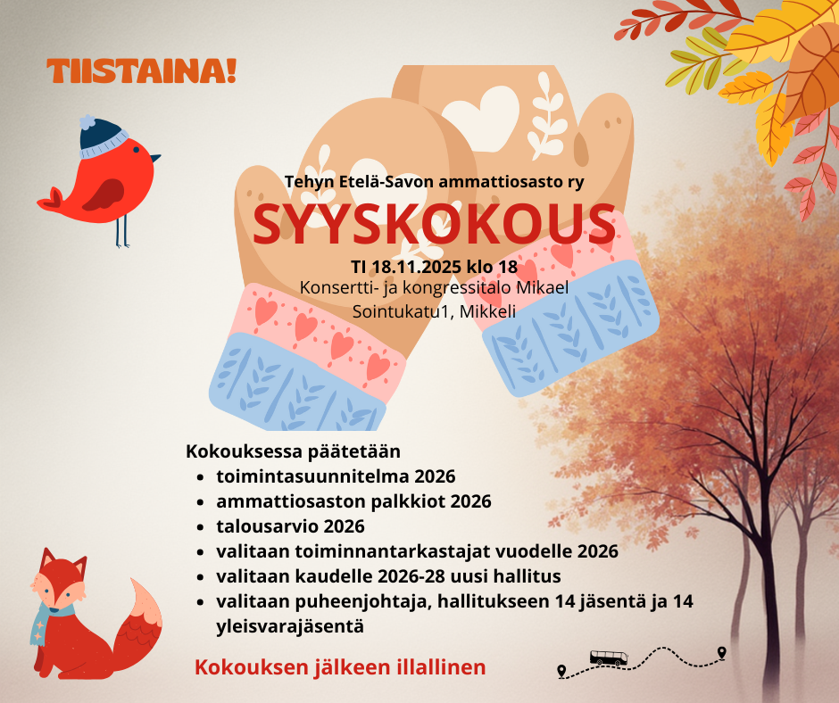 Syyskokouksessa 18.11.2025 valittiin Tehyn Etelä-Savon ammattiosastolle uusi hallitus toimikaudelle 19.11.2025- 31.12.2028. Puheenjohtaja: Maritta Mynttinen. Hallituksen varsinaiset jäsenet: Hirn Anne…