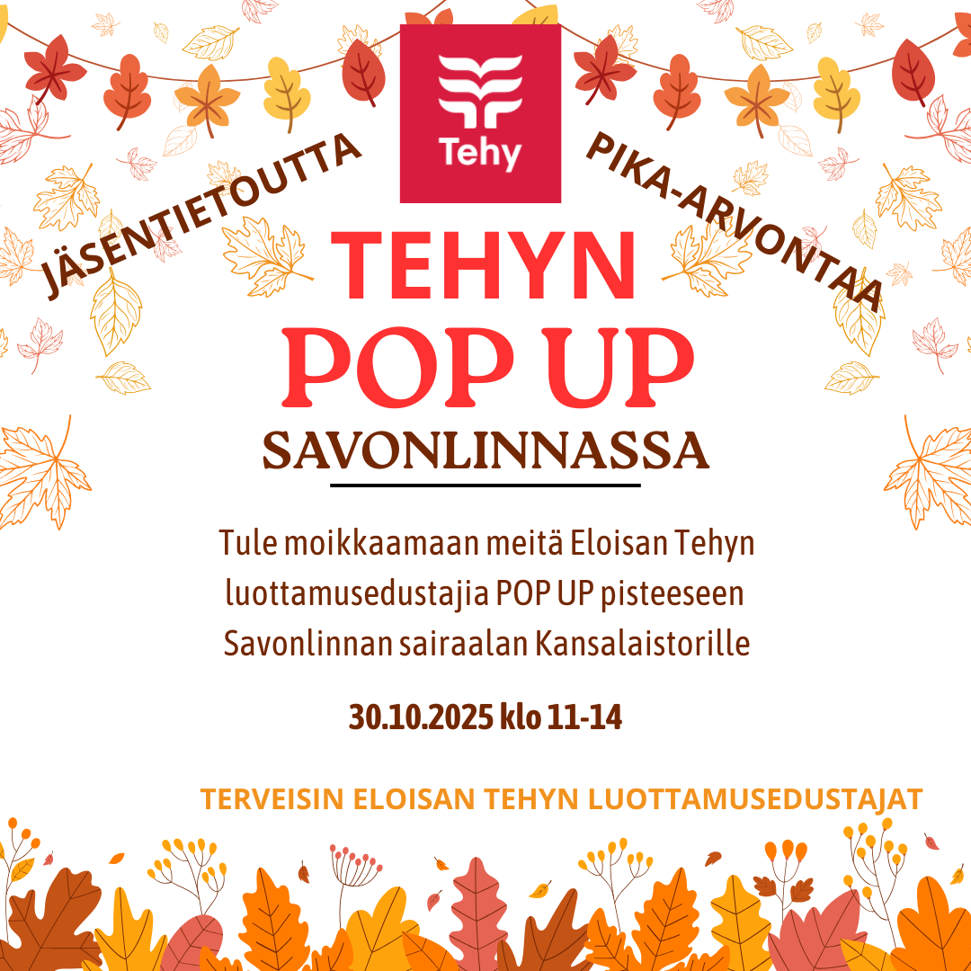 SAVONLINNA! Tehyn Etelä-Savon ammattiosaston POP UP jalkautuu Savonlinnan sairaalan Kansalaistorilla TO 30.10 klo 11-14. Tule tapaamaan luottamusedustajia ja voit samalla osallistua pika-arpajaisiin.…
