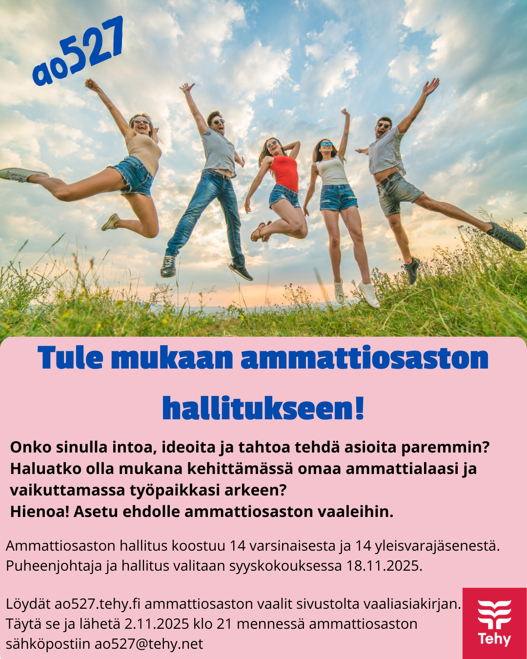 Ammattiosaston hallituksen vaalien ehdokasasettelu on alkanut! Lähde ehdokkaaksi ja pääset vaikuttamaan oman ammattiosastosi toimintaan ja paikalliseen edunvalvontaan. - Olet mukana parantamassa…